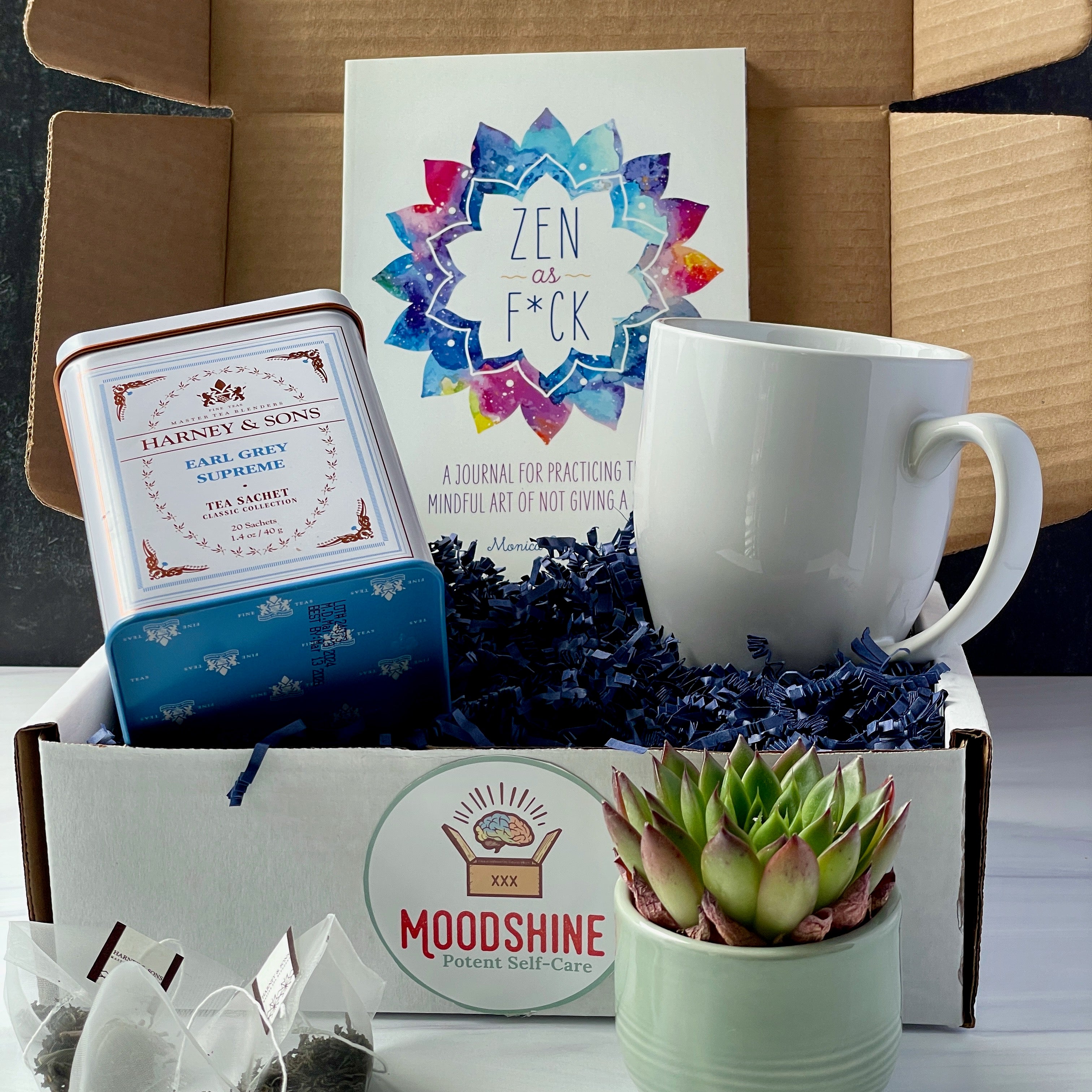 The Moodshine™ Box is a monthly therapist-curated collection of items to support your mental well-being.